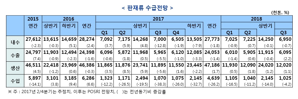 내수는 조선 및 자동차 산업의 침체 등으로 2017년 하반기 감소세로 전환하고 연간으로도 1.8% 감소할 전망이다. 2017년 제품별 내수는 중후판이 30% 수준 감소하고 냉연 및 아연도 제품은 소폭 증가할 것으로 예상됐다.