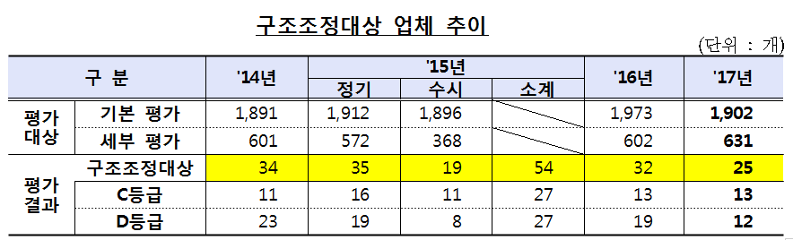 금융감독원은 3일 '2017년 정기 대기업 신용위험평가 결과 및 향후계획'을 발표했다. 이번 평가는 지난해보다 29개 많은 대기업 631개사를 상대로 진행됐다. 이 중 25개사가 C등급(13개사)과 D등급(12개사)을 받아 구조조정 대상으로 분류됐다.