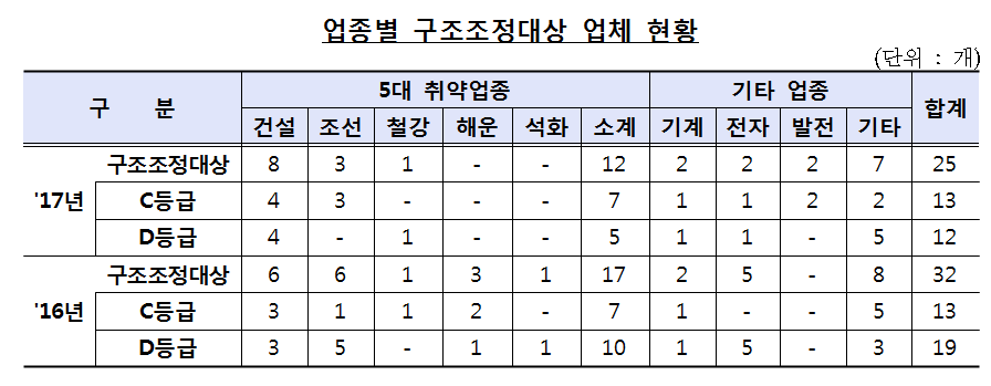 업종별로는 건설업이 8개사로 가장 많고, 조선업(3개사), 기계업, 전자업, 발전업(각 2개사), 철강 1개사 순이었다. 지난해 구조조정 대상에는 건설과 조선이 각 6개사, 해운 3개사, 철강 및 석유화학이 1개사 선정된 바 있다.