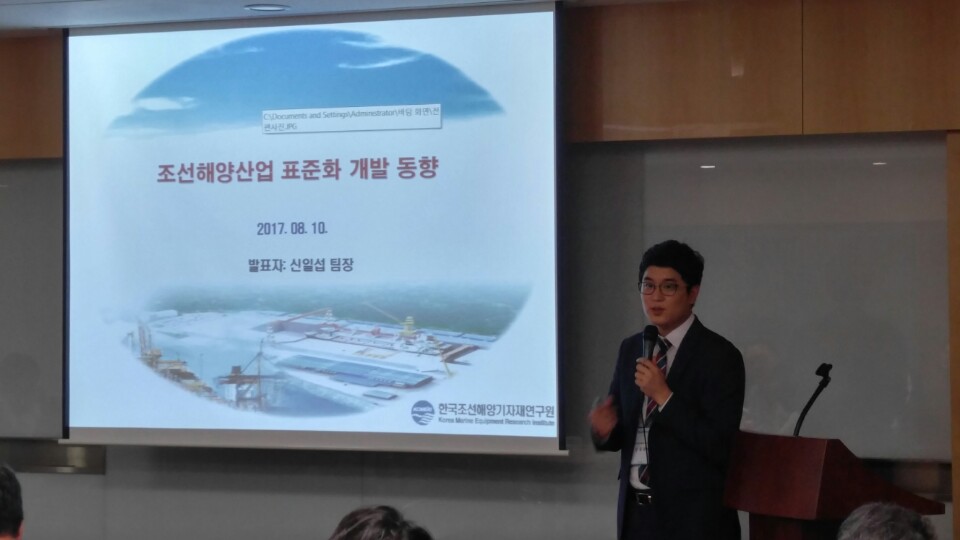 한국조선해양기자재연구원 신일섭 팀장은 조선해양산업에서 이뤄지고 있는 표준화 작업에 대해 설명했다. 일례로 북극항로 개발을 위해 꾸준한 기술개발이 필요하다. 극지환경에서 선박 및 기자재가 얼기 때문에 히팅시스템이 반드시 필요하다. 로테르담에서 부산까지 기존 항로를 이용할 경우 24일이 걸리지만 북극항로를 이용하게 되면 14일이면 충분하다. 이를 위해 삼성중공업과 조선해양기자재연구소가 안정성 기술을 개발해 조선해양산업 표준화로 적용시켰다.
