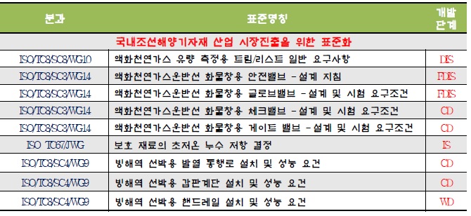 해양플랜트 및 조선산업의 경우 국내 규격은 물론 전세계 규격이 필요하기 때문에 표준화활동이 활발히 이뤄지고 있다. 해양플랜트용 강재 표준이 국가별로 다를 경우 국가간 협의기간에 오랜 기간이 걸려 납기지연이 발생하게 된다. 또한 프로젝트 이후 남은 강재를 처리하기 어렵기 때문에 재고비용도 높아진다. 이를 해결하기 위해 해양플랜트 산업에 주로 사용되는 강재 위주로 강재 사양을 대폭 축소해 표준화 작업이 진행중이다.