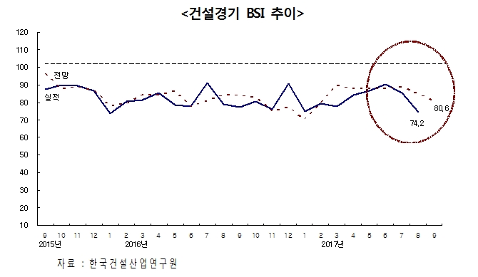 한국건설산업연구원은 2017년 8월 CBSI가 전월비 11.2p 하락한 74.2로 집계돼 지난 2016년 1월(73.5) 이후 1년 7개월 만에 가장 낮은 수치를 기록했다고 발표했다.