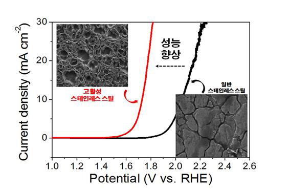 니켈이 10%, 크롬이 20% 함유된 스테인리스 스틸을 선택해 강한 알칼리성 수용액에 넣고 전류를 가하자, 니켈이 녹아 합금 표면에 NiOOH(니켈옥시하이드록사이드)라는 물질을 만들었다. 이 물질은 물을 분해하는 촉매로 쓸 수 있는 활성을 보였다. 강한 알칼리성 수용액에서 활성을 보이는 기존 촉매와 달리 중성 수용액에서도 높은 활성을 나타내는 것이 특징이다.