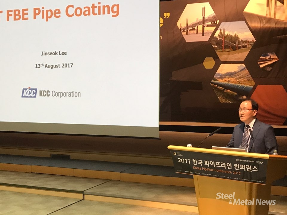 KCC 이진석 박사는 13일 포스코센터 4층 아트홀에서 열린 파이프라인 세미나에서 강관분체 도장에 대해 설명했다.