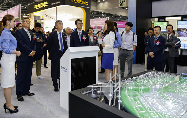일산 킨텍스에서 열리고 있는 대한민국 에너지대전에서 포스코에너지 전시장을 부스를 찾은 내빈들이 포스코에너지의 스마트발전소와 신재생에너지 사업에 대해 설명을 듣고 있다. 왼쪽 두번째부터 윤동준 포스코에너지 사장, 이인호 산업통상자원부 차관, 강남훈 한국에너지공단 이사장.