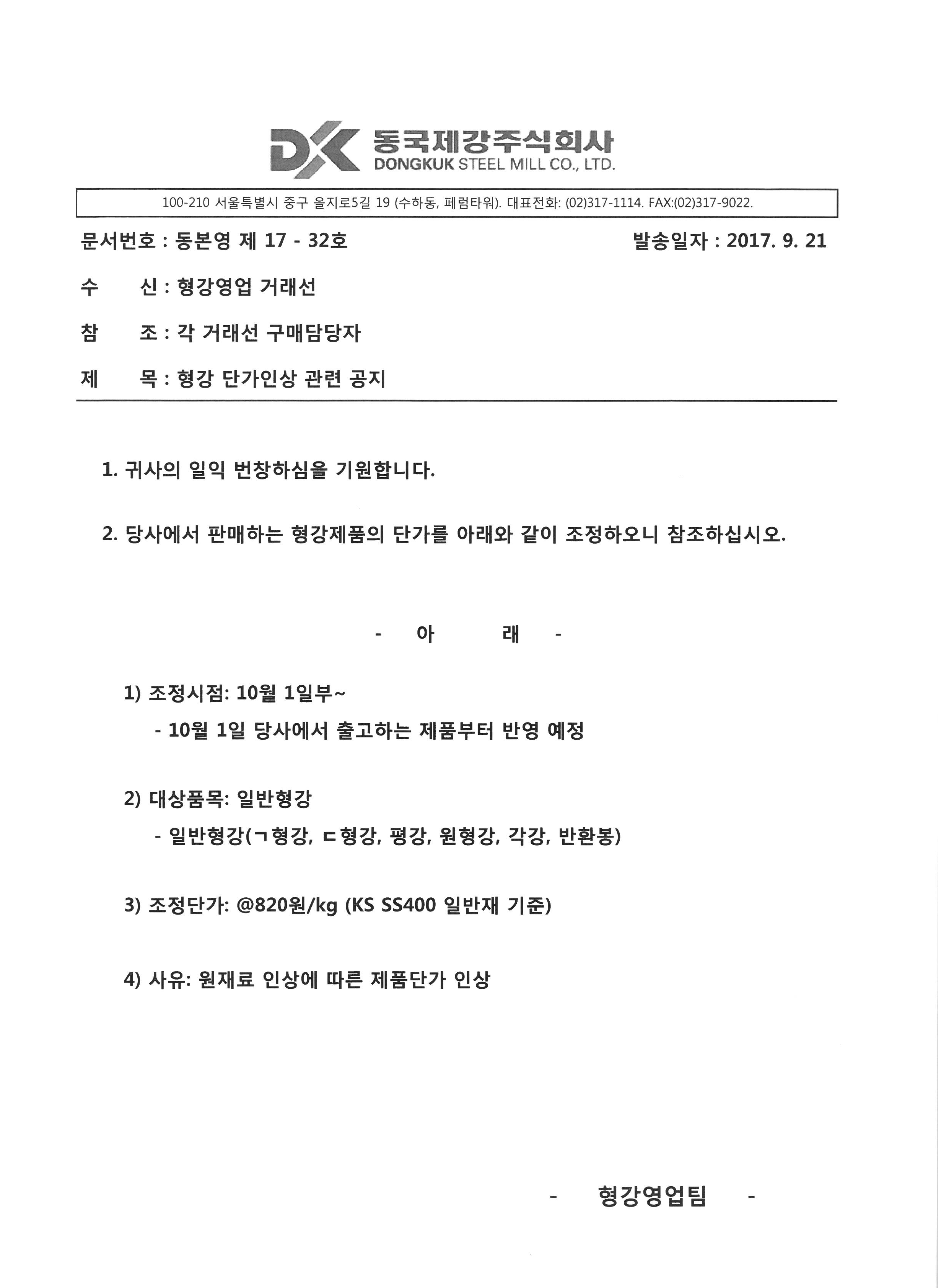 유통업계에 따르면 오는 10월 1일부터 동국제강은 앵글, 채널 등을 비롯한 일반형강 가격을 톤당 3만원 인상해 톤당 82만원(SS400 일반재 기준)에 판매한다.