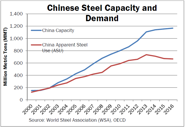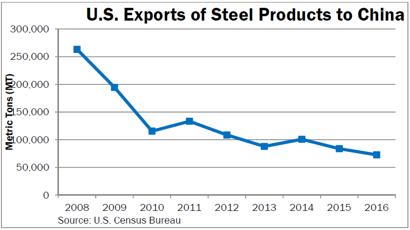 2. 2000년부터 2016년까지 중국의 연간 조강생산량은 6억8,000만톤가량이 늘어났다. 이는 지난해 미국의 조강생산량의 8배에 달하는 수준이다. 중국의 조강생산량이 이렇게 늘어날 수 있었던 이유는 정부로부터 부당한 보조를 받았기 때문이다. 중국은 보조금 정책 뿐 아니라 VAT시스템을 조작해 철강 수출을 관리하고 있다.