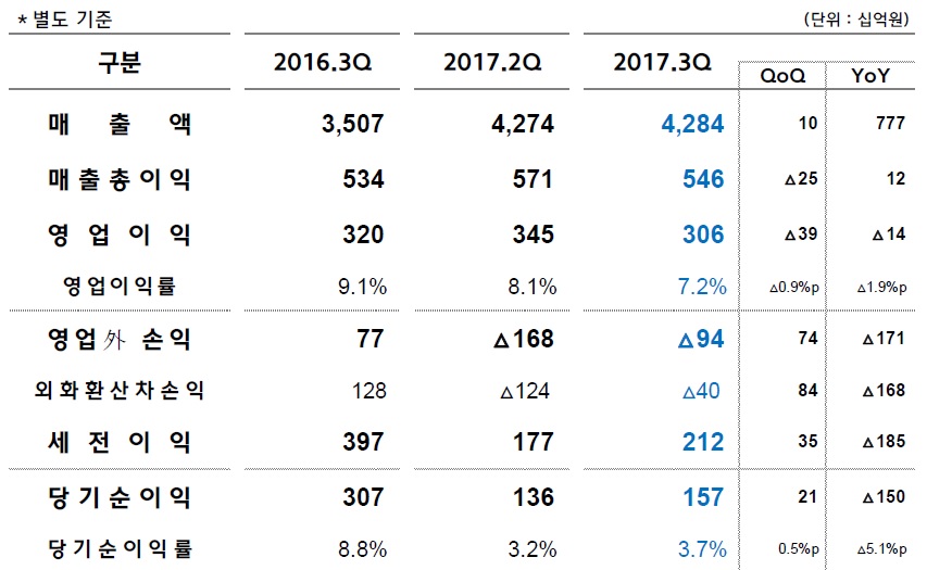 별도기준 매출액은 4조2,840억원을 기록했고 영업이익은 3,060억원, 순이익은 1,570억원을 기록했다.