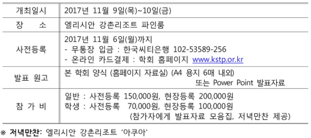 오는 11월 6일까지 사전에 등록할 수 있으며, 발표 원고는 본 학회 양식(홈페이지 www.kstp.or.kr 자료실, A4 용지 6매 내외) 또는 Power Point 발표 자료를 활용하면 된다.