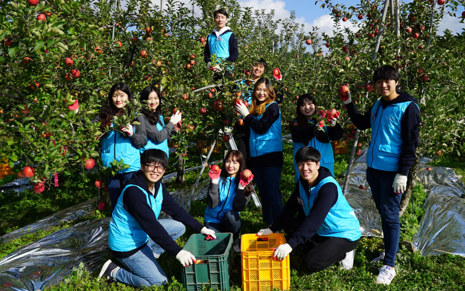 해피예스 봉사단의 ‘홈커밍데이’는 이 같은 취지에 맞춰, 해피예스 봉사단 출신의 선배들과 현재의 봉사단원들이 함께 봉사활동을 펼치는 연례 활동으로 올해는 현대제철 사업장이 위치한 포항의 과수 농가를 방문해 사과를 따는 봉사활동을 펼쳤다.