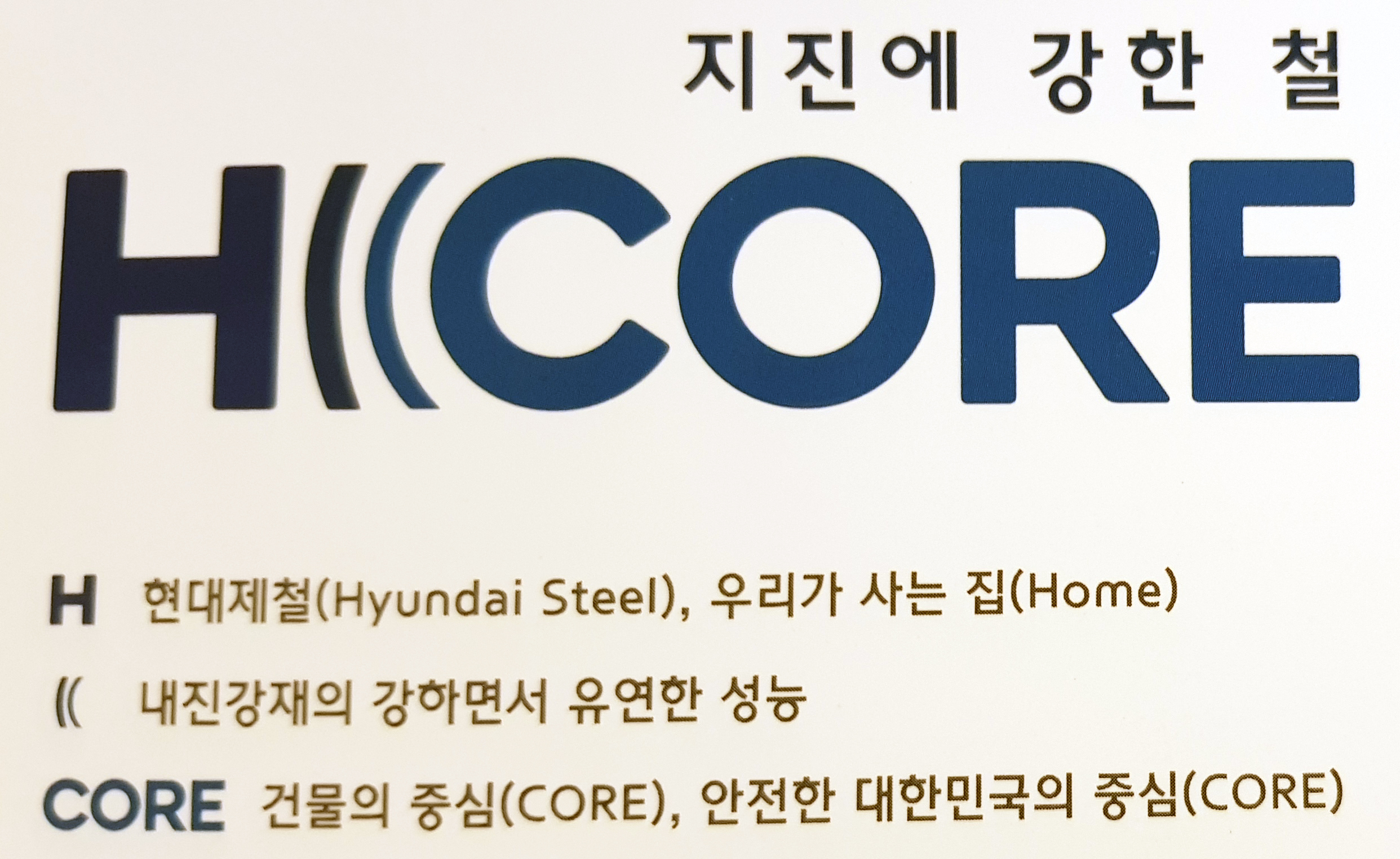 현대제철이 런칭한 건축물의 안전가치를 높이기 위한 내진강재의 브랜드명은 ‘H((Core(에이치코어)’다. ‘에이치코어(H((Core)’는 현대제철(Hyundai Steel)과 우리가 사는 집(Home), 내진강재의 강하면서 유연한 성능(((), 건물의 중심(CORE)과 안전한 대한민국의 중심(CORE)를 의미한다. 더 안전한 대한민국을 만들겠다는 현대제철의 의지를 담고 있다.