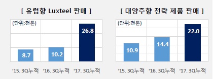 뿐만 아니라 컬러강판 고부가제품 판매 확대를 통해 이익도 증가했다. 고급건재 럭스틸 프리미엄, 가전 라미나, 프린 제품 등의 판매가 늘었으며 올해 3분기 누적 고부가 제품 판매 비율은 17.3%로 지난해 16.3%보다 증가했다.
