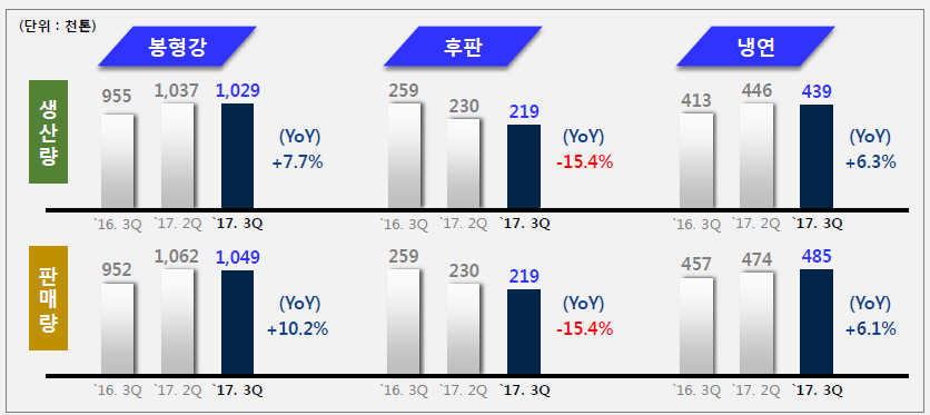 2017년 3분기 봉형강 생산량은 총 102만9,000톤으로 전년 동기 대비 7.7% 증가했다. 같은 기간 봉형강 판매량은 104만9,000톤으로 전년 동기 대비 10.2% 증가했다.