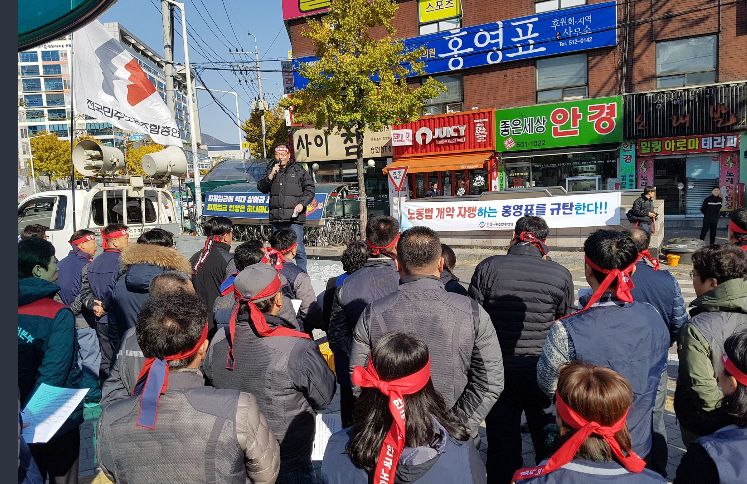 15일 오전 인천 부평구 갈산동 홍영표의원 지역 사무실 앞에는 민주노총과 한국노총 소속 조합원 70여 명(경찰 추산)이 모여 최저임금 삭감 시도를 중단하라고 압박했다. 양대 노총은 또한 이날 공동결의대회를 시작으로 정부 여당 압박 등 근로기준법과 최저임금법 개악 저지를 위한 공동 투쟁을 전개한다고 밝혔다.