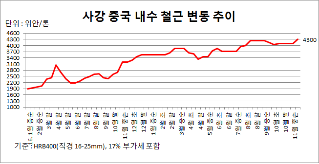 중국 최대 철근 제조업체인 사강이 11월말 중국 내 철근 가격을 톤당 4,300위안(약 648달러)으로 인상한다고 발표했다.
