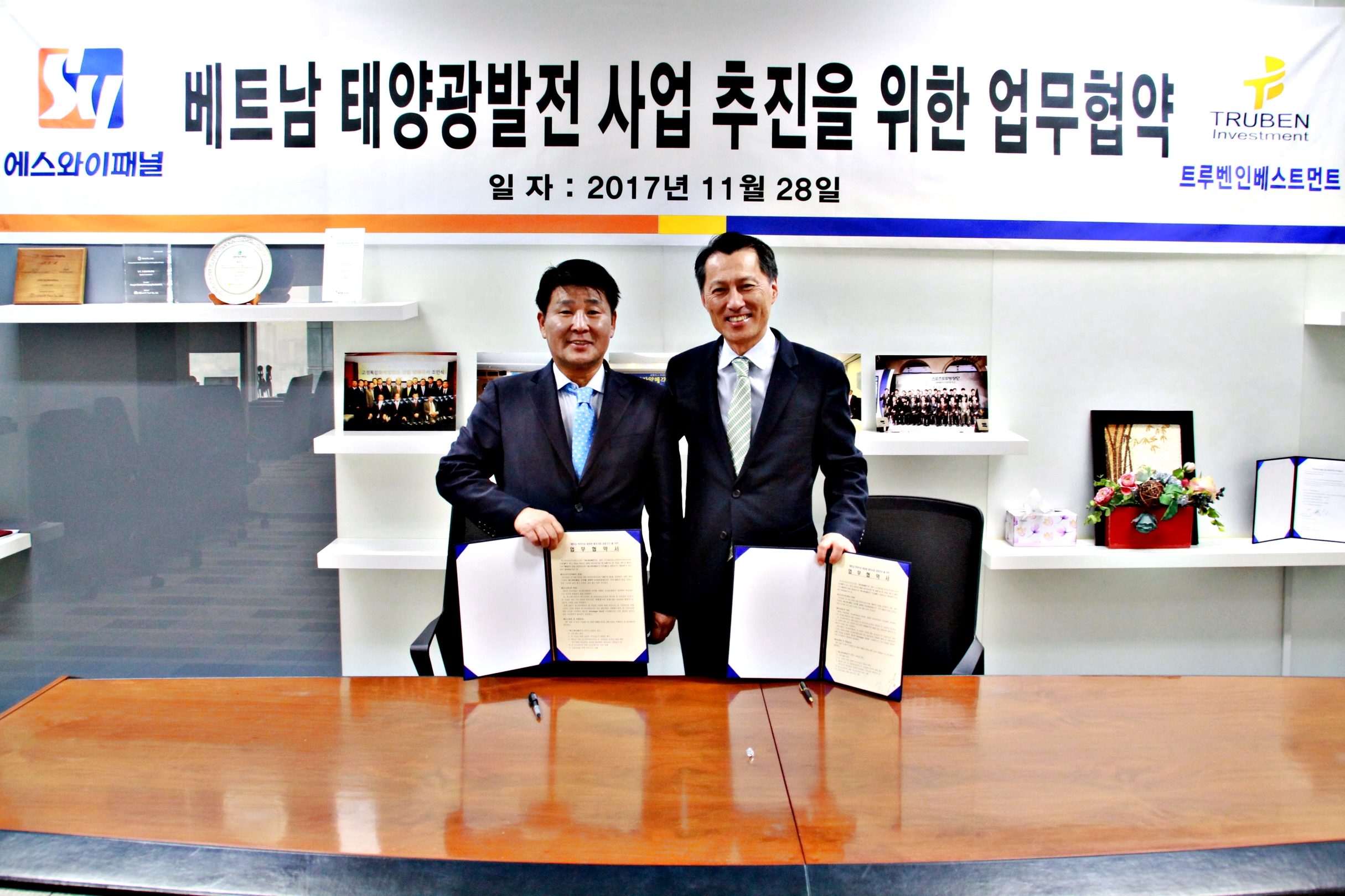 종합건축자재 전문기업 에스와이패널(주)이 28일 트루벤인베스트먼트 여의도 본사에서 베트남 박리에우성 태양광발전사업 추진을 위한 업무협약을 체결했다.