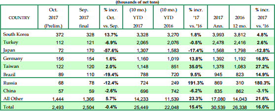 10월에도 우리나라는 미국으로 가장 많은 철강재를 수출했다. 한국은 총 37만2,000톤을 수출, 9월과 비교해 14% 증가했다. 독일은 2% 증가한 15만6,000톤, 대만은 2% 증가한 12만2,000톤, 터키는 7% 감소한 11만2,000톤을 미국으로 수출했다.