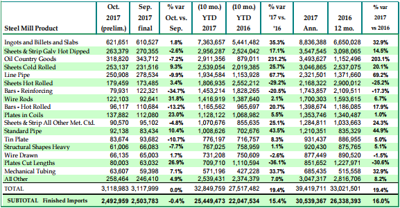 미국 철강 수입이 증가를 유지 중이다. 미국철강협회 (American Iron and Steel Institute, AISI)에 따르면 미국이 10월 한 달간 수입한 철강재는 311만9,000톤으로, 전년비 19% 증가했다. 이 중 완성재는 249만3,000톤이었다.