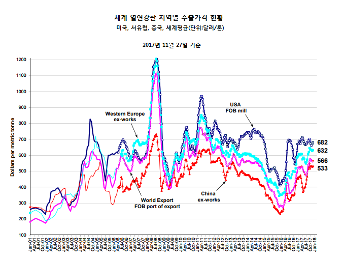 서유럽 HR 가격(ex-works 기준)은 2주 전보다 6달러 오른 632달러를 기록했다. 서유럽 HR 가격은 2015년 11월 23일 기준 346달러를 기록한 이후 현재까지 총 286달러가 올랐다.