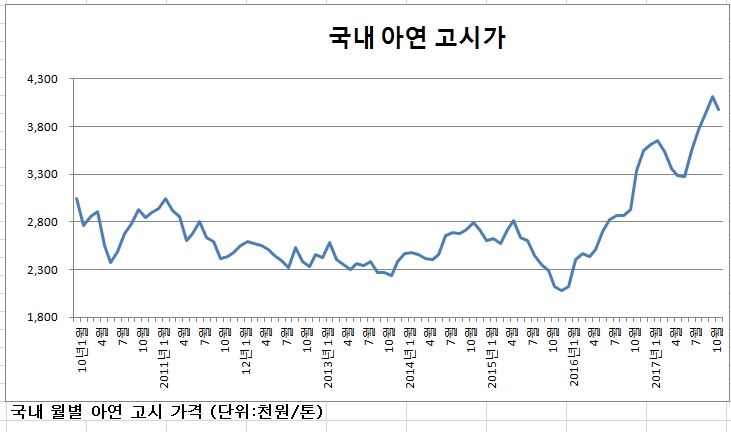 2018년 1월 국내 아연 고시 가격 등락 향방은 12월 원/달러 환율이 1,100원대 이상에서 형성되느냐와 12월 LME 아연 평균 가격이 톤당 3,200달러대 이상을 유지하느냐에 따라 결정될 것으로 전망된다.