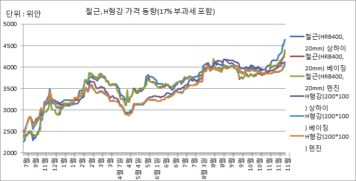 중국 11월 5주차 철근·H형강 내수 가격(17% 부과세 포함)이 급등했다.