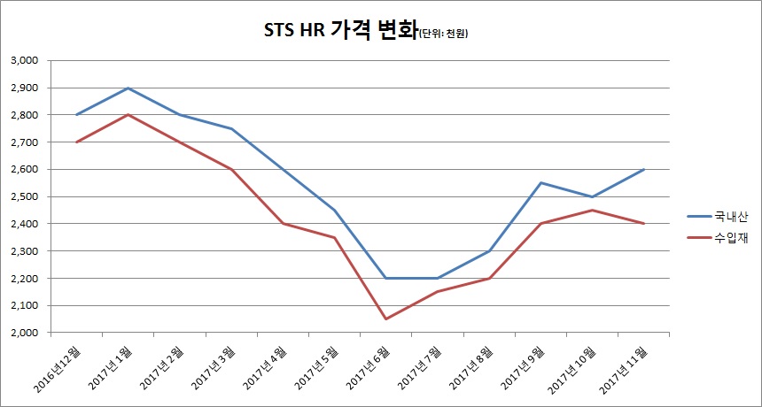 수입재 가격이 하락하면서 국내 가격 또한 영향을 받고 있다. 지난 9월부터 STS 출하가격은 계속 올랐으나 수입재 가격이 떨어지면서 국내산 가격이 상승하지 못하고 있는 상황이다. 수입재와 가격차이가 크게 벌어질 경우 국내산을 쓰던 업체라도 수입재로 돌아서는 경우가 많기 때문에 수입재 가격에 따라 국내산 가격 역시 내려가고 있다.