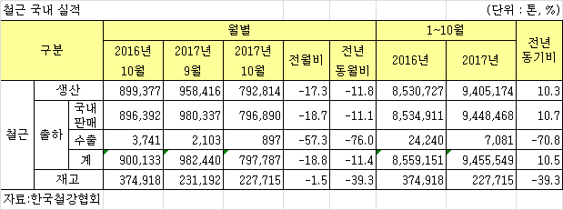 판매량뿐만 아니라 생산량도 2016년 10월 대비 감소했다. 올 10월 7대 제강사의 철근 생산량은 79만2,814톤으로 지난해 동월 생산량 89만9,377톤 대비 11.8% 줄었다.