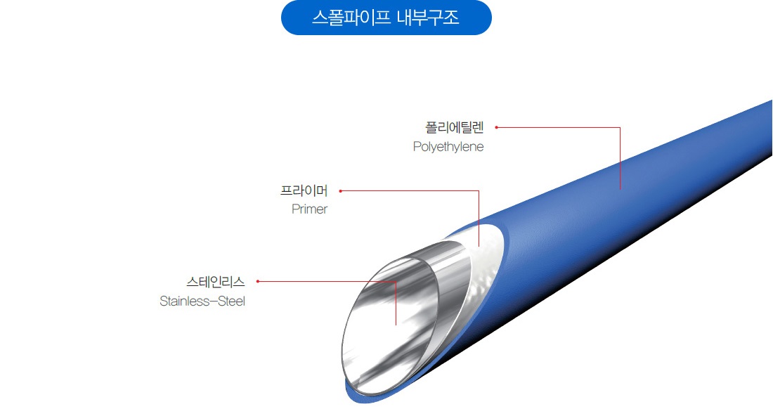 스폴파이프는 직관과 롤관으로 제작이 가능하며 롤관으로 설치 시 50m이상 이음관 없이 시공이 가능해 이음 부속을 최소화하여 시공 시간과 비용을 획기적으로 줄일 수 있다. 기존 STS 파이프는 물론 일반 PE관과 같은 규격이기 때문에 기존의 이음부속을 사용할 수 있다.