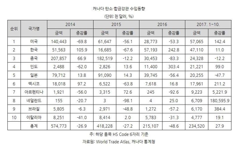 탄소·합금강관은 석유·가스 배관용 파이프로 중력 배수시설, 가스 배관, 석유화학 플랜트 등에 사용된다. 캐나다가 최근 인프라 사업을 확충하면서 현지 수요가 늘고 있다. 캐나다의 올해 1~10월 탄소·합금강관 수입액은 2억3,452만달러로 지난해 같은 기간보다 27.9% 늘었다. 같은 기간 한국은 캐나다 전체 수입액의 20.1%(4,711만달러)로 수입시장 1위를 차지했다.