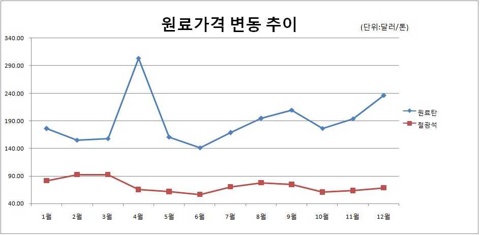원료탄의 경우 최근 톤당 230달러를 넘어선 가운데 한 달 만에 33%나 급등했다. 철광석 가격 역시 톤당 60달러 후반대로 최근 들어 하락이 나타났지만 여전히 높은 수준을 기록하고 있다.