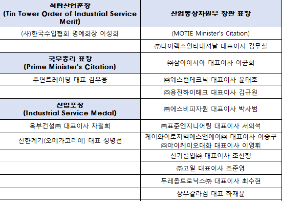 주요 포상에는 (사)한국수입협회 이성희 명예회장이 석탑산업훈장을 수상했고 옥부건설(주) 차철희 대표이사, 신한계기 정명선 대표가 산업포장 을 수상했다.