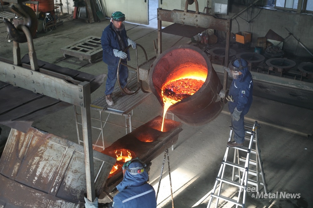 ▲ 남북평화의 종 주조를 위해 성종사 직원들이 쇳물을 붓고 있다. (사진=뿌리뉴스)