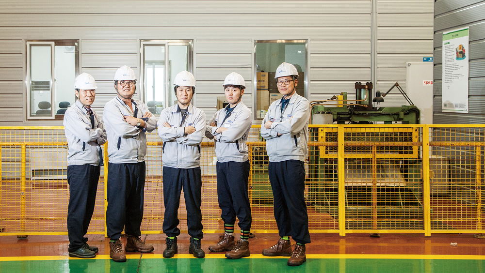 그동안 같은 품질관리팀 소속임에도 검사반은 공장 내 입구에 있고, 실험실은 본관 1층에 터를 잡고 있었다. 지난 8월, 기존의 검사반 맞은 편 자리에 통합건물을 만들고 뭉쳤다. 편한 것이 한두 가지가 아니다. 우선 물성 보증 업무 시간이 단축되었고, 검사반과 실험실이 한 지붕 아래에 있는 만큼 협업이 유리해졌다. 무엇보다 마음 편하게 쉴 수 있는 안전공간이 생겼다. 가을하늘 높고 맑은 날 구정옥 SP, 홍순봉 직장, 정인선 반장, 곽영기 반장, 신우빈 사원 이렇게 다섯 명의 품질관리팀원을 한 자리에서 만났다.