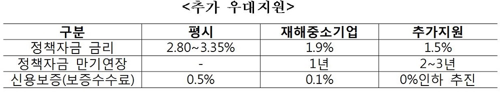 이어 “현재 대출이율 인하(2.80∼3.35% →1.9%), 대출금 1년 만기연장 및 보증수수료 인하(0.5%→0.1%) 등 지진 피해기업에 대해 지원하고 있다”며 “추가로 기재부와의 협의를 거쳐 파격적으로 대출조건 변경(대출이율 1.9%→1.5%, 만기연장 2~3년 연장)을 추진하겠다”고 덧붙였다.