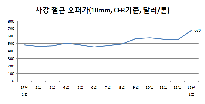 이는 직전 12월말적 오퍼가격인 톤당 552달러(10mm, CFR기준)에서 128달러 인상된 톤당 680달러이다. 13mm 이상의 규격은 톤당 670달러에 오퍼 가격이 책정됐다.