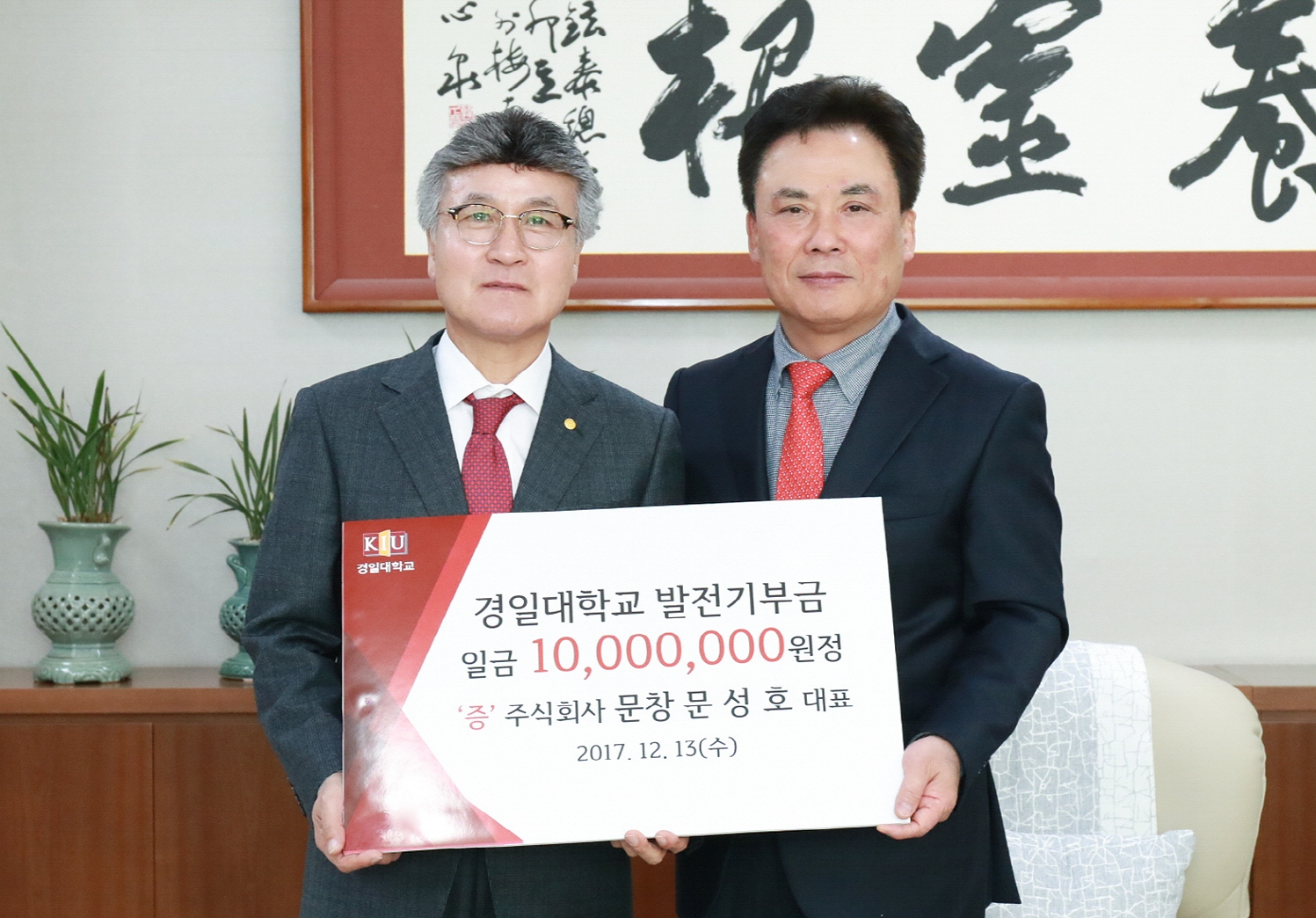 스테인리스 물탱크 제조업체 (주) 문창 문성호 대표가 지난 13일 경일대학교 총장실을 방문해 정현태 총장에게 대학발전기부금 1,000만원을 전달했다.