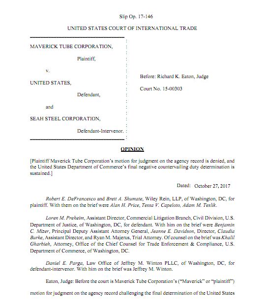 미국 CIT에 따르면 지난 10월 미국 철강업체 매버릭튜브코퍼레이션이 미 상무부와 세아제강을 대상으로 낸 한국 철강사의 전기료 특혜 여부에 따른 불리한가용정보(AFA)적용과 관련된 소송에서 원고 패소 판결을 결정했다.