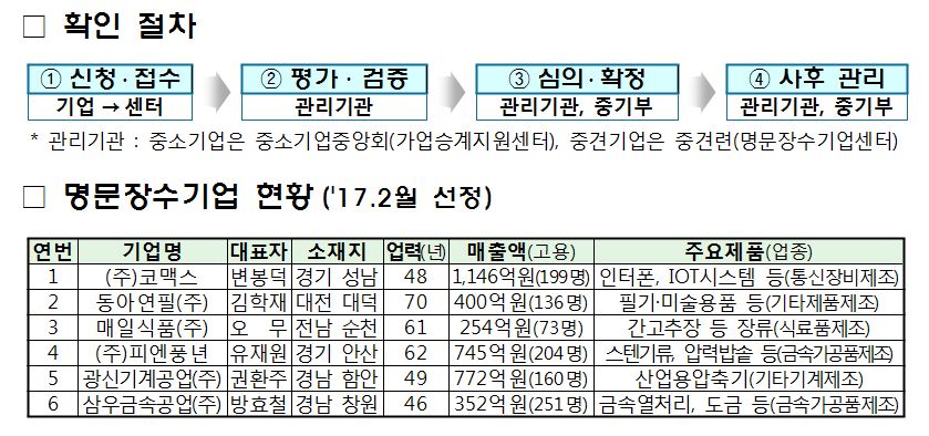 명문장수기업확인제도는 중소기업 성장의 바람직한 롤 모델을 제시하고, 사회적 책임을 다하는 모범기업을 발굴해 기업들이 존경받는 문화를 확산하기 위해 도입된 제도로, 올해 2월 처음으로 6개 중소기업을 명문장수기업으로 지정한 바 있고, 올해부터는 매출액 3,000억 원 미만의 중견기업까지로 신청대상을 확대해 운영한다.