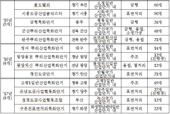 지정한 4개 단지(총 120개 회사)는 주조, 표면처리 업종에 특화되어 있으며, 이중 3개 단지는 조성완료, 은남도금사업협동화단지는 2019년 조성완료 한다.