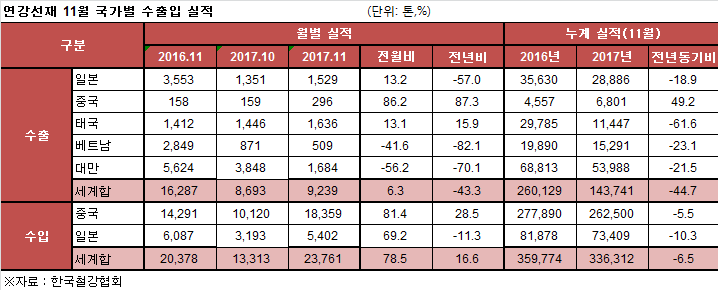 한편, 2017년 11월 연강선재 수출량은 9,239톤으로 전년대비 43.3% 줄었다. 특히 베트남과 대만 수출량은 509톤, 1684톤으로 지난해보다 각각 82.1% 70.1% 감소했다.