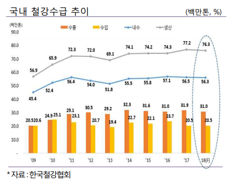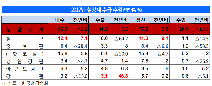 생산은 건설 경기가 둔화되고 수입 규제가 심화되면서 올해보다 1.2% 감소할 것으로 보이고 내수는 건설, 조선 등 수요산업이 부진할 것으로 예상돼 올해 대비 소폭 감소할 전망이다.