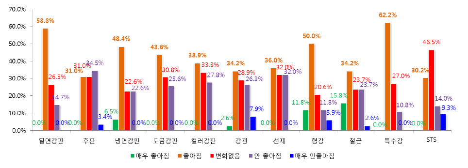 내년 상반기 업종별 전망의 경우 조선과 건설은 나빠질 것으로 예상했으며 자동차, 가전, 기계, 플랜트, 에너지용 수요는 개선될 것으로 전망하고 있는 것으로 나타났다.