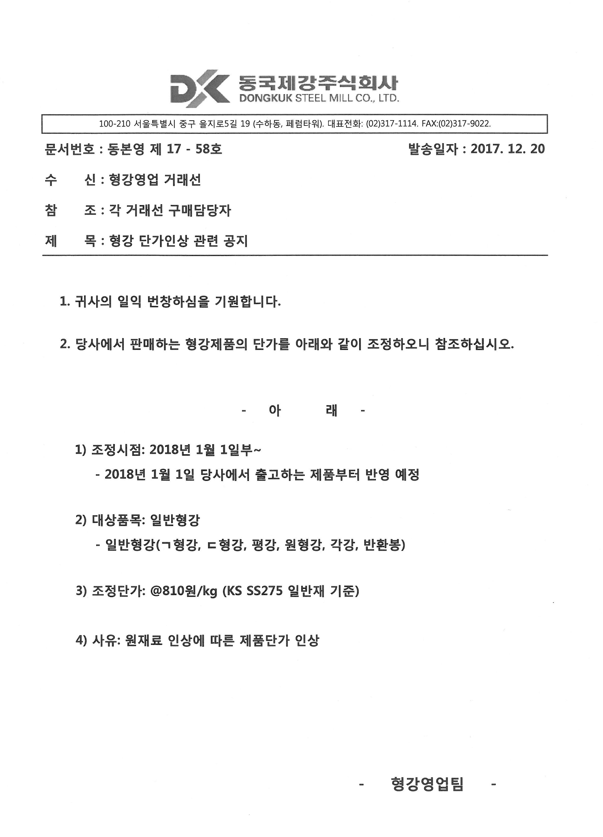 동국제강에 따르면 오는 1월 1일부터 동국제강은 앵글, 채널 등을 비롯한 일반형강 가격을 톤당 5만원 인상해 톤당 81만원(SS275 일반재 기준)에 판매한다.
