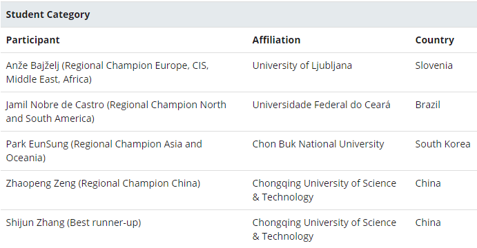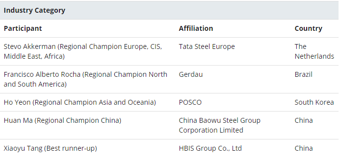 학생부문에는 전북대학교의 박은성씨가, 산업부문에서는 포스코의 호연씨가 최종 후보 명단에 올랐다. 두 사람 모두 아시아 및 오세아니아 권역별 챔피언 자격이다.