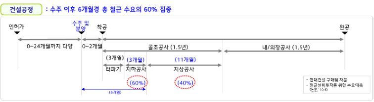 이후 두 번째 단계인 수주 및 분양부터 세 번째 단계인 착공까지 통상 0~2개월이 걸린다고 전문가는 설명했다. 착공부터 본격적으로 시작되는 골조공사(총 1년5개월) 중에 터파기(3개월)+지하공사(3개월) 등 철근의 총 60%가 수주 이후 6개월 안에 소비된다.