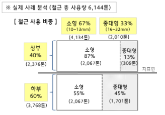 업계 전문가는 철근 소형 규격(10~13mm)이 하부보다 상부에서 훨씬 많이 쓰인다고 분석했다. 우선 전체 철근 사용 비중에서 하부가 60%, 상부가 40% 가량 차지한다. 지표면을 기준으로 하부에서 철근 소형 규격 사용량은 55% 정도이고, 중대형(16~32mm) 규격은 약 45%를 차지한다.