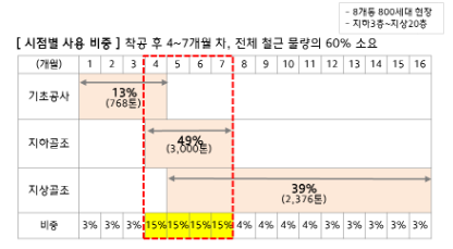 착공 후 4~7개월차 사이, 4개월간 전체 철근 물량의 60% 소비