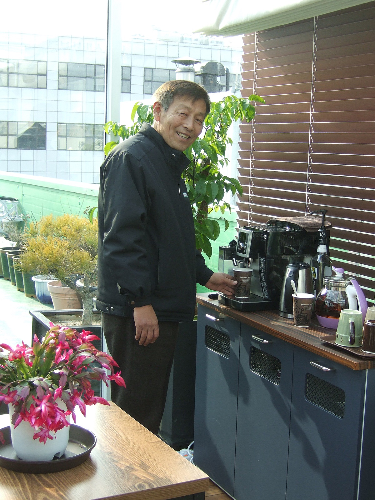 A) 회사 사옥 옥상에 온실과 원두막에 이어 최근 직원 및 찾아오는 고객들을 위한 쉼터와 휴식공간으로 까페를 운영하고 있다. 완공한지 1개월 정도 됐는데 아늑하고 분위기가 아주 좋다.