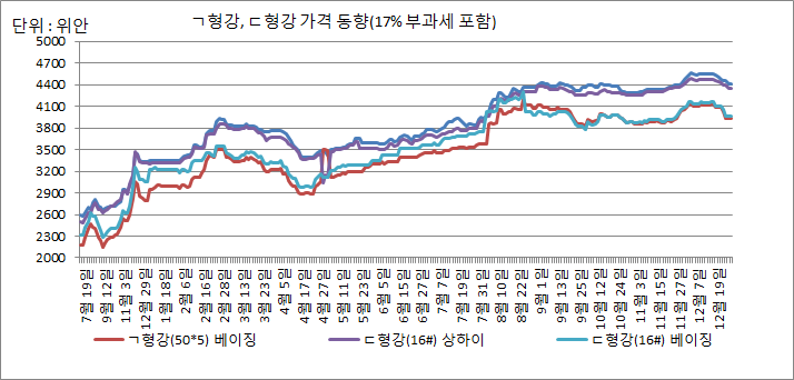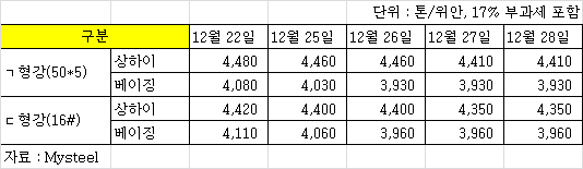 중국 12월 5주차 앵글·채널 내수 가격이 ‘약보합’을 보이고 있다. 안종호 jhahn@snmnews.com 다른 기사 보기 관련기사 中 11월 3주차 앵글·채널價 ‘보합’ 中 11월 2주차 앵글·채널價 ‘혼조’ 4월 2주차 中 ㄱ형강, 내수價 보합 저작권자 © 철강금속신문 무단전재 및 재배포 금지