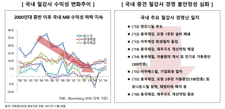 이밖에 강관 업체들의 구조조정의 경우 2016년 한양철강, 동훈에스피 등 자동차용 강관 제조업체들의 법정관리 및 부도와 2017년 구조관 업체인 동아스틸의 법정관리까지 자금 사정이 좋지 못한 업체들은 경영위기를 극복하지 못했다.